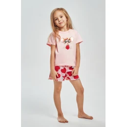 Souprava se skládá z trička s krátkým rukávem, jehož přední stranu zdobí barevný potisk, který pyžamu dodává šarm a pozitivní energii. Soupravu doplňují krátké šortky, které jsou ideální pro teplejší noci a letní období. Lehká přírodní tkanina zajišťuje volnost pohybu a pohodlí po celou noc.