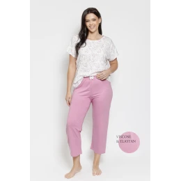 Vrchní díl pyžama tvoří bavlněné tričko s krátkými rukávy a kulatým výstřihem, zdobené jemným květinovým potiskem, který celku dodává svěží a stylový charakter. Přírodní bavlna je měkká, vzdušná a šetrná k pokožce. Soupravu doplňují pevné kalhoty v délce 7/8 z vysoce kvalitní viskózy s elastanem, který zajišťuje lehkost, pružnost a dokonalé přizpůsobení.