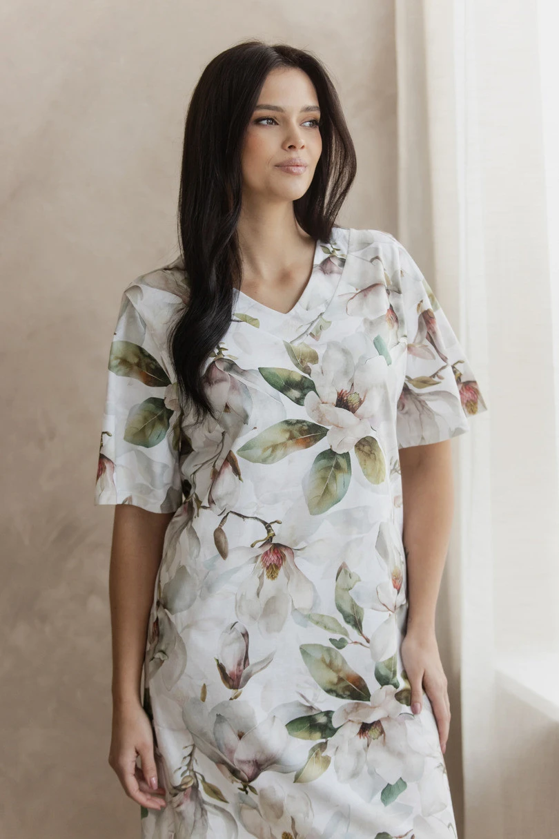 Koszula została wykonana w 100% z wysokiej jakości bawełny, która jest miękka, przewiewna i przyjazna dla skóry. Całość zdobi subtelny roślinny print, nadający koszuli świeżego i stylowego charakteru. Dekolt w szpic delikatnie podkreśla szyję i optycznie wysmukla sylwetkę, a krótki rękaw zapewnia komfort noszenia, szczególnie w cieplejsze dni.