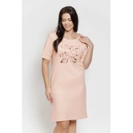 Košile s kulatým výstřihem a krátkými rukávy je ideální po celý rok, i za teplejších nocí, a na přední straně má ozdobný, jemně třpytivý potisk, který dodává eleganci a jemně zdůrazňuje ženskost modelu.