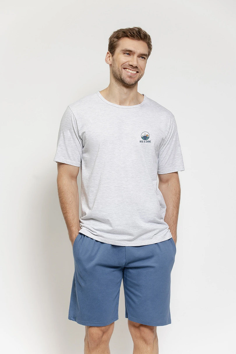 Pánské pyžamo Gabriel 3577 je pohodlná a praktická souprava ideální pro teplé noci a domácí relaxaci. Souprava se skládá z trička s krátkým rukávem a krátkých šortek v kontrastní barvě, která celku dodává moderní a sportovní charakter.