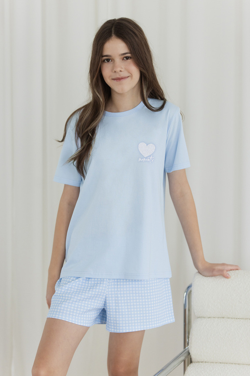 Tričko zdobí na přední straně barevný potisk, který dodává pyžamu dívčí charakter a díky němuž vypadá souprava módně a vesele. Krátké šortky poskytují pohodlí a volnost pohybu během spánku.