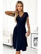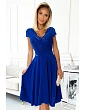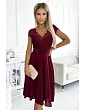 Model má krajkový horní díl s výstřihem do V a krátkými krajkovými rukávy. Pas je zvýrazněn hladkým páskem s jemnými záhyby a spodní díl tvoří rozšířená midi sukně, která hezky splývá. Krajku najdete také na zádech, díky čemuž je celý vzhled ucelený a elegantní.