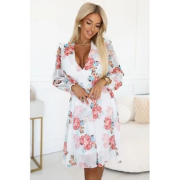 Vzdušné květinové obálkové šaty s dlouhými rukávy. Lehká tkanina, ženský střih a jemný vzor ideální na jaro a léto. Polský výrobek - značka Numoco.