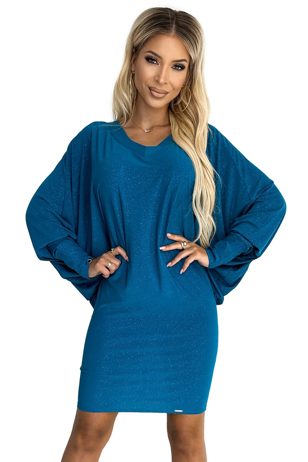 402-3 Netopýří šaty s výstřihem - mořská barva s třpytkami