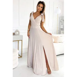 ELENA - maxi dlouhé šaty s výstřihem, rozparkem na nohavicích a mašlemi na ramenou. Z materiálu příjemného na dotek v béžové barvě s třpytkami. polský výrobek. značka numoco.