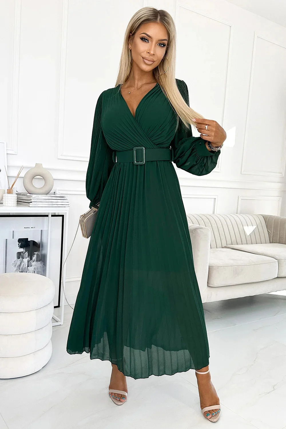 Klara - plisované šifonové šaty s výstřihem, dlouhým rukávem a páskem. plisování na výstřihu a rukávech dodává šatům eleganci. barva: lahvově zelená. značka numoco.