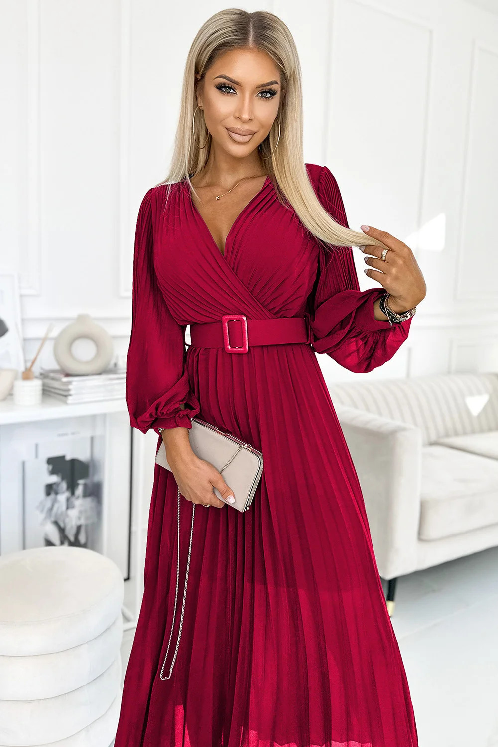 Klara - plisované šifonové šaty s výstřihem, dlouhým rukávem a páskem. plisování na výstřihu a rukávech dodává šatům eleganci. barva: bordó. značka numoco.