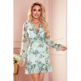 Šifonové šaty s elastickým pasem a volánky. jemné volánky po celých šatech. květinový vzor na zeleném pozadí. vyrobeno z šifonu příjemného na dotek s podšívkou (95% polyester, 5% elastan). značka numoco. polská výroba.