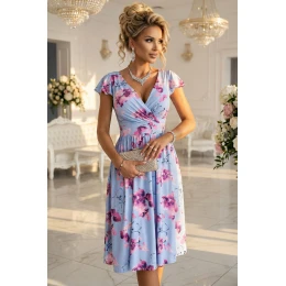425-14 MATILDE Blinkered midi šaty s obálkovým výstřihem a krátkými rukávy - modré s růžovými květy