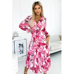 Valentina - šifonové midi šaty s obálkovým výstřihem, dlouhými rukávy a páskem. Vzor: růžové růže na bílém pozadí. Značka numoco. Evropská produkce.