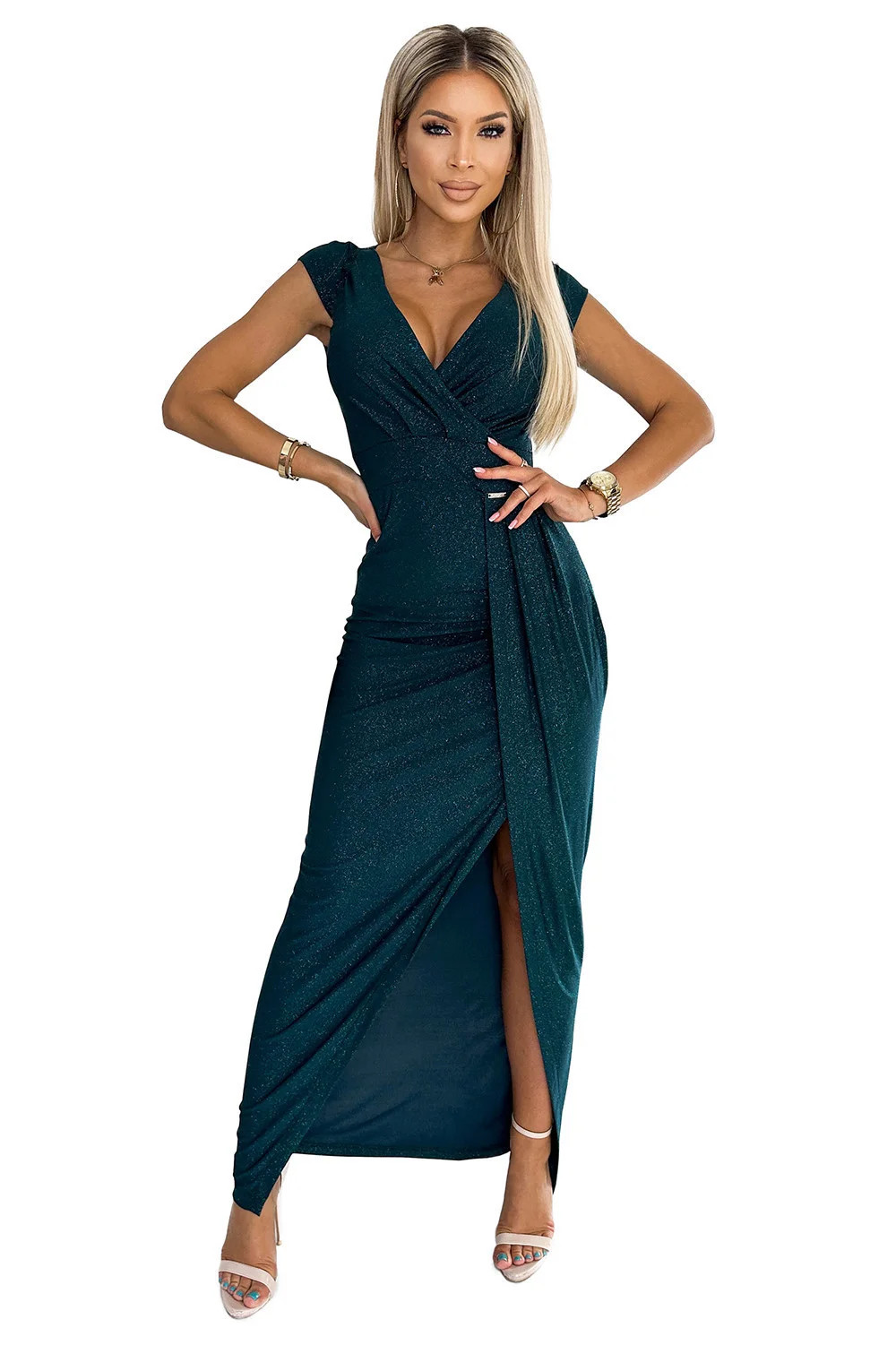 Lesklé šaty s krátkými rukávy, obálkovým výstřihem a rozparkem na nohavici. Vyrobené z elastického materiálu se třpytkami. barva: lahvově zelená. značka Numoco. polská výroba.