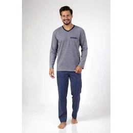 Klasické pánské pyžamo s dlouhými rukávy z kvalitní bavlny. Jednobarevné tričko s výstřihem a náprsní kapsou, vzorované kalhoty s dlouhými nohavicemi.