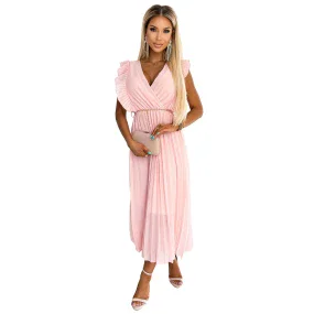 Giorgia - plisované šifonové šaty s obálkovým výstřihem, volánky na ramenou a zlatým řetízkem. broskvová barva. značka numoco. evropská výroba.