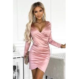 Elegantní saténové šaty s obálkovým výstřihem a dlouhými rukávy. barva: špinavě růžová. ze saténu, mírně elastického materiálu (95% polyester, 5% elastan). zapínání vzadu na krytý zip. značka numoco. polská výroba.