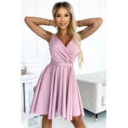 Maya - asymetrické šaty s delším zadním dílem, výstřihem a páskem. Barva: špinavě růžová. Sukně s delším zadním dílem bude ideální na tanec. polská výroba. značka Numoco.