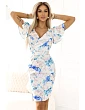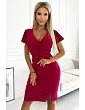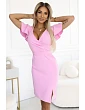 Model má obálkový výstřih, který pěkně zvýrazňuje horní část, a krátké rukávy zakončené jemným volánkem. Pas je zvýrazněný, se zavazováním na zádech, díky kterému se šaty lépe přizpůsobí postavě. Midi délku a přiléhavý tužkový lem doplňuje rozparek na přední straně, díky kterému se šaty snadno pohybují po celý den i večer.
