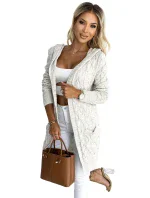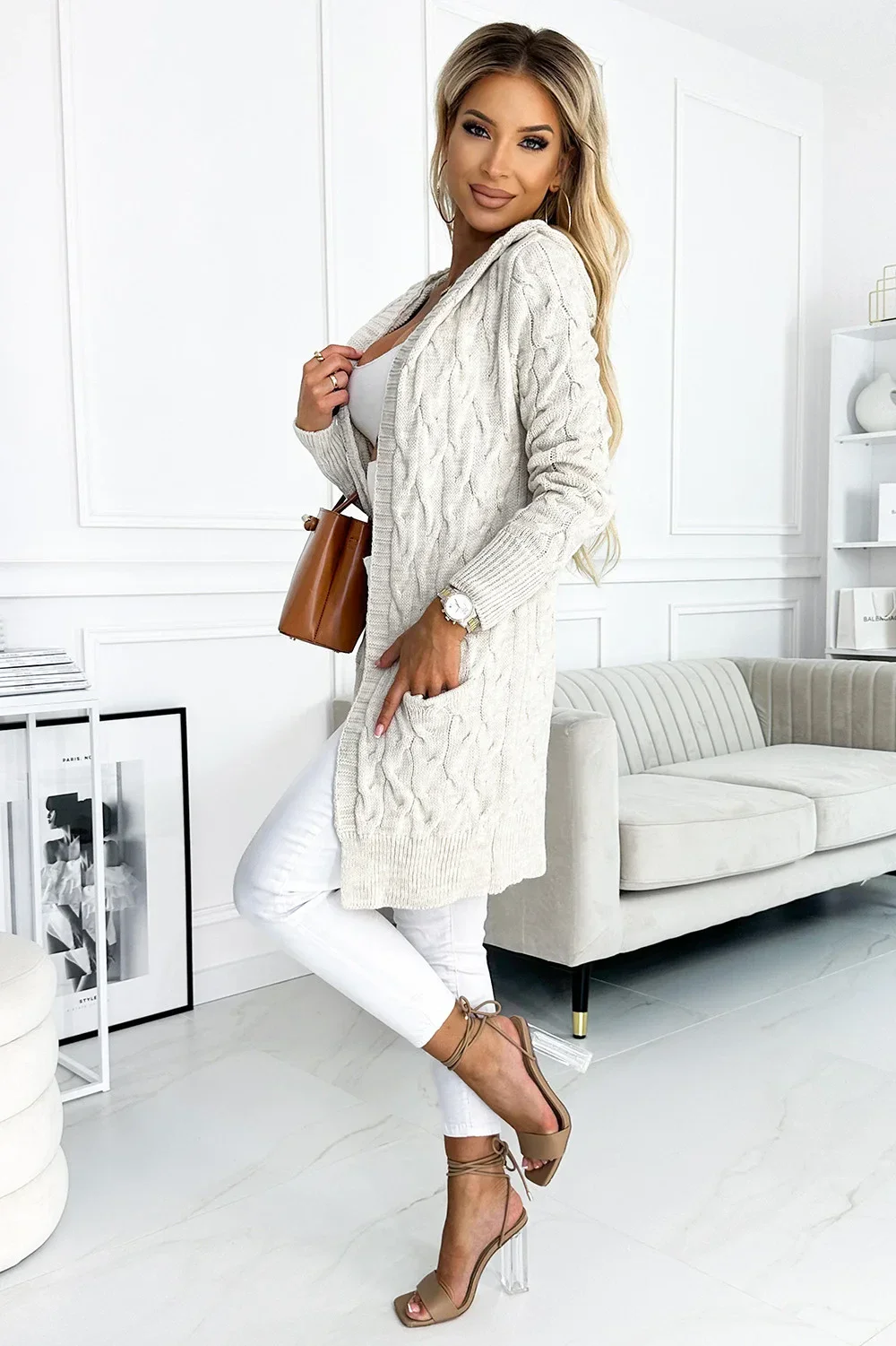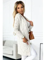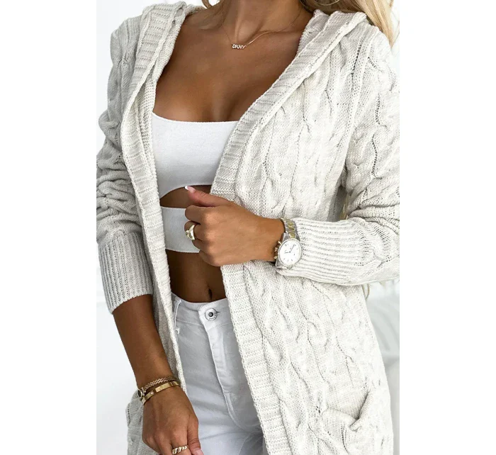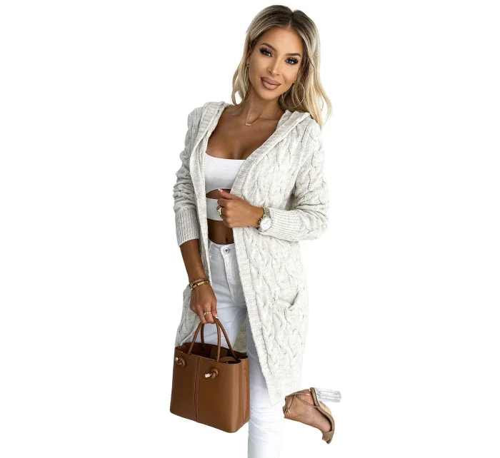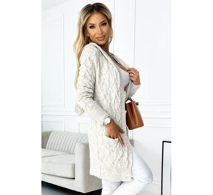 Hřejivýsvetr s kapucí a kapsami , vyrobený z béžové svetrové látky s kostkovaným vzorem, značky numoco, vyrobený v Evropě.