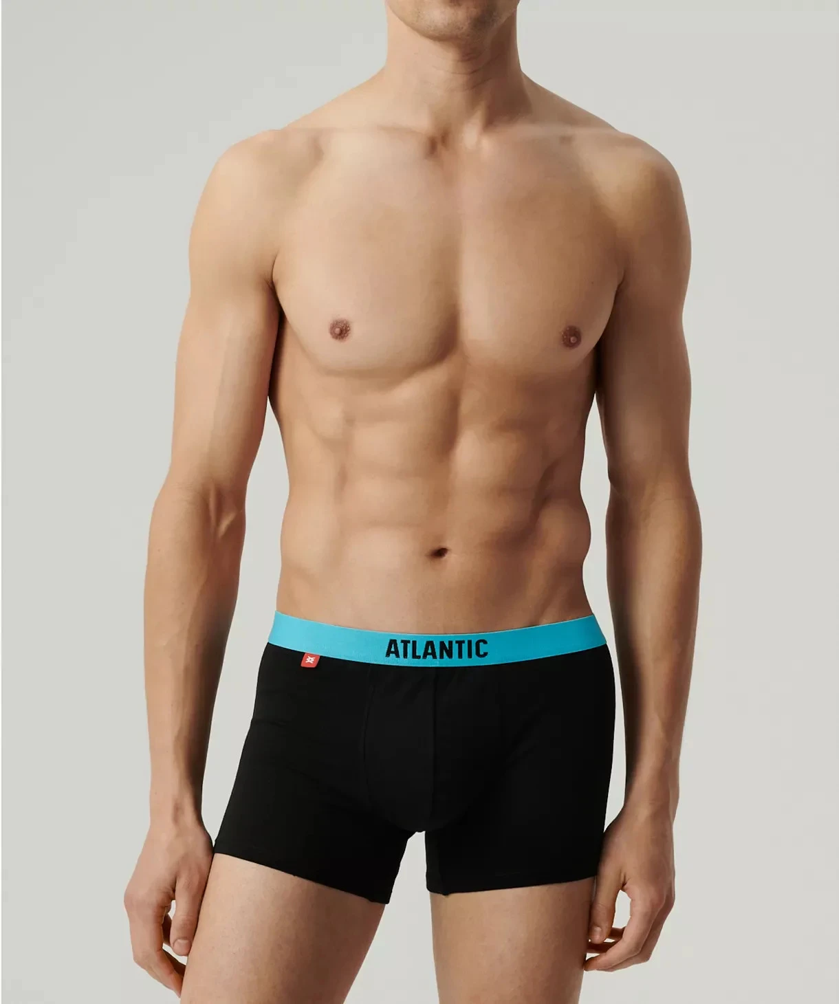 Pětice sportovních boxerek v elegantní černé barvě, každá s odlišným barevným pasem — od světle modré přes oranžovou až po sytě červenou. Boxerky mají moderní nízký střih a pas zakončený jemnou, netlačící gumou s logem Atlantic. Boky jsou standardní délky, takže padnou každému muži.