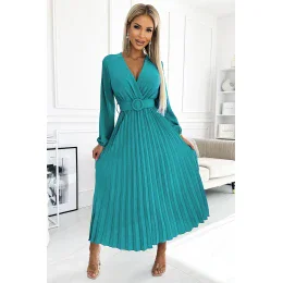 Plisované midi šaty VIVIANA s obálkovým výstřihem, dlouhými rukávy a širokým páskem. Vyrobené z krepového materiálu v barvě moře. Perfektní šaty pro každou příležitost. Značka numoco basic. Evropská výroba.
