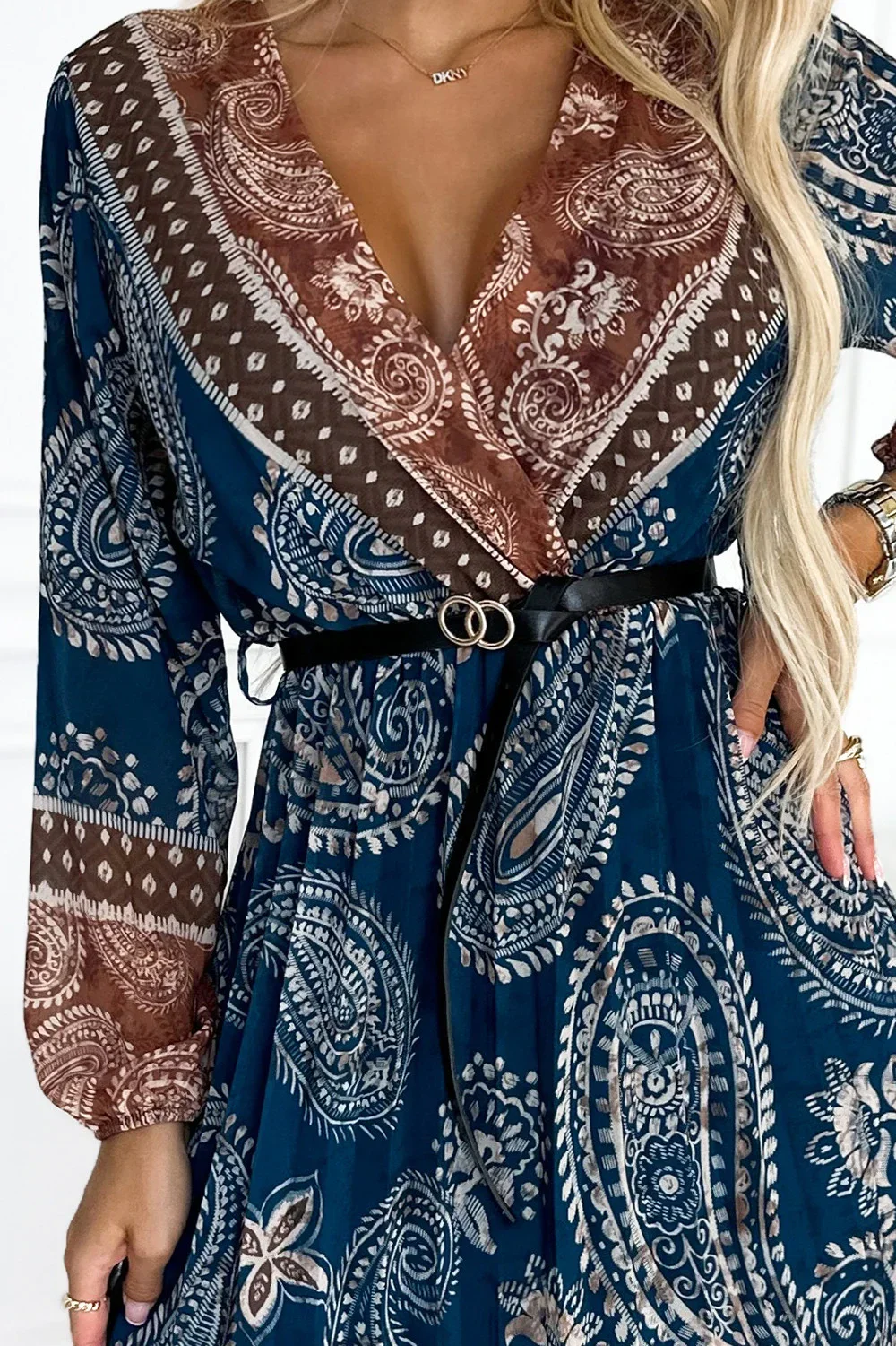 510-1 Plisované midi šaty s výstřihem, dlouhými rukávy a černým páskem - modro-hnědý vzor