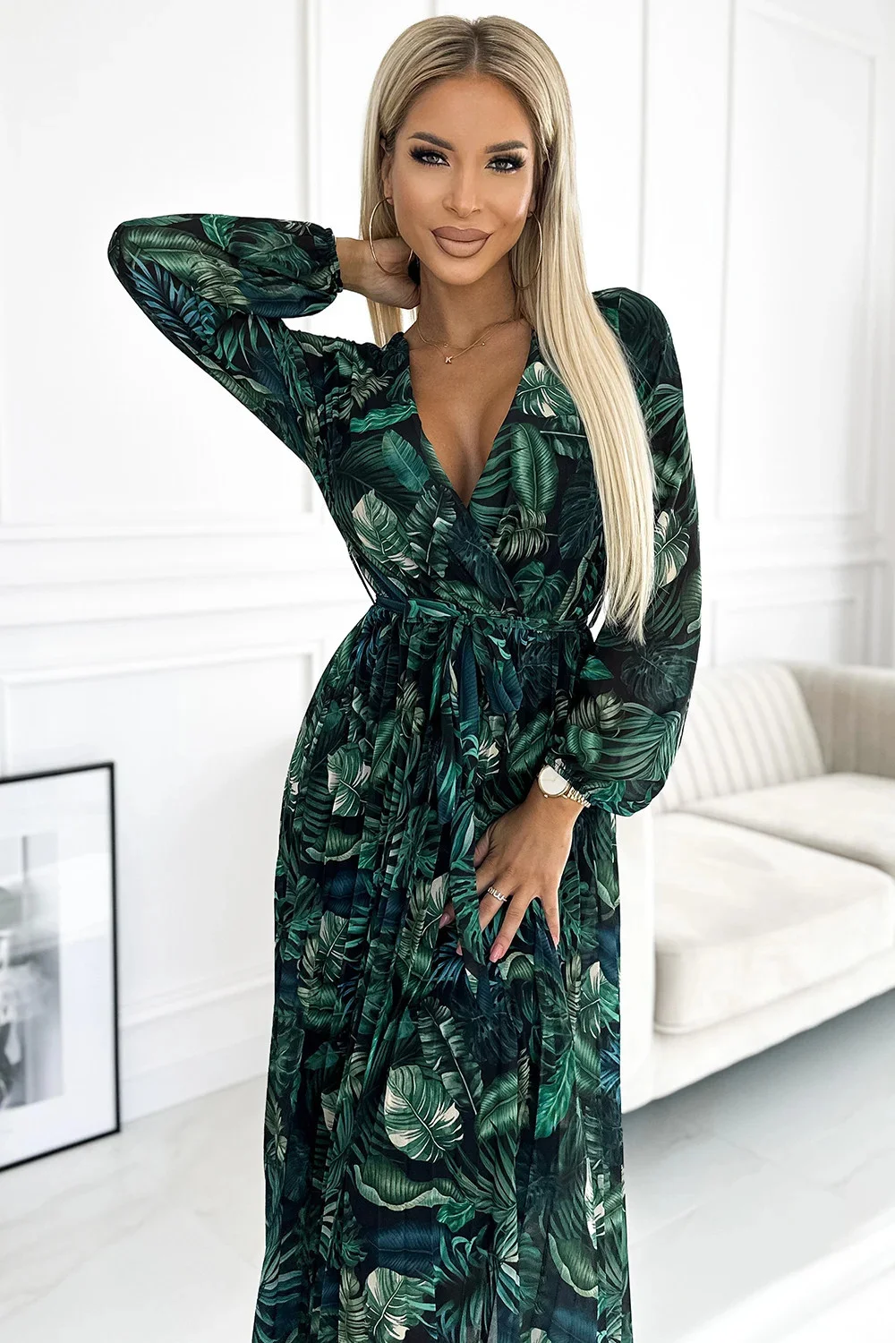 511-1 Plisované šifonové dlouhé šaty s výstřihem, dlouhými rukávy a páskem - GREEN LEAVES