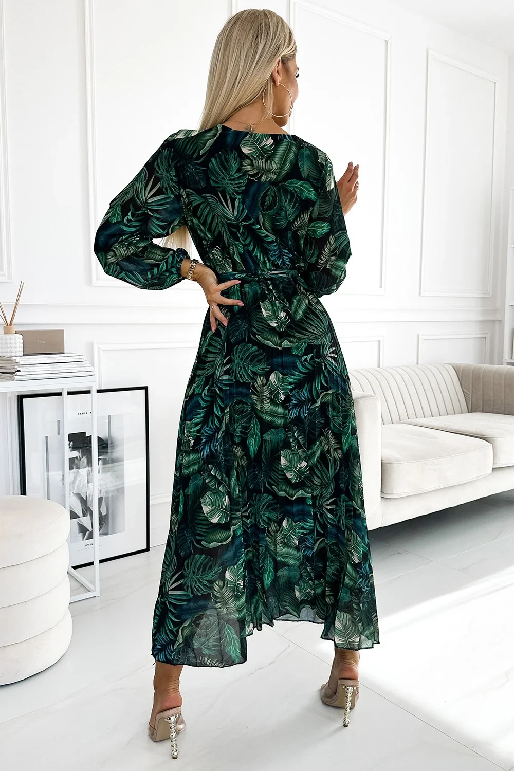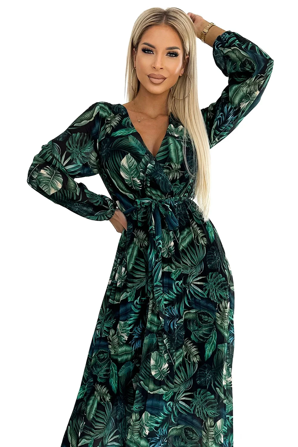 Plisované dlouhé šaty s obálkovým výstřihem, dlouhými rukávy a páskem na zavázání. Vyrobené z šifonové látky s podšívkou. Vzor: zelené listy. Perfektní šaty pro každou příležitost. značka numoco basic. evropská výroba.