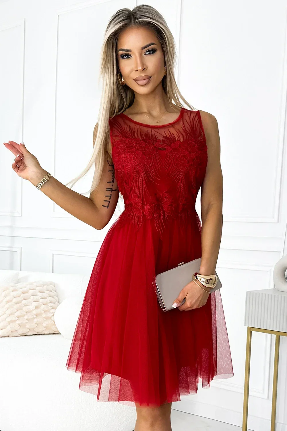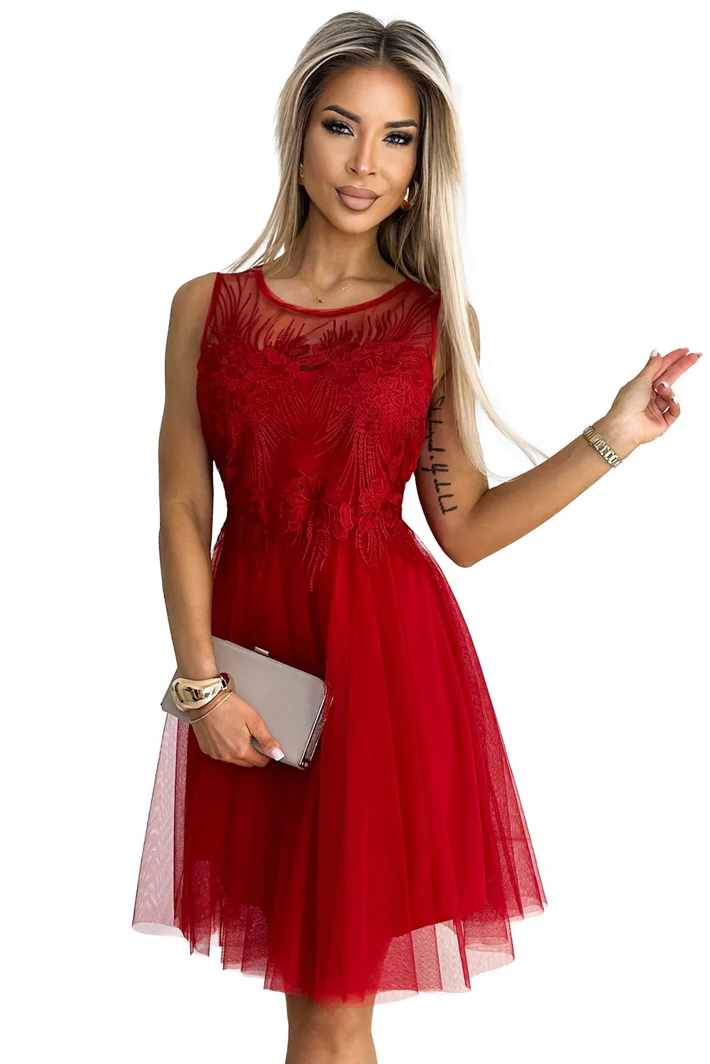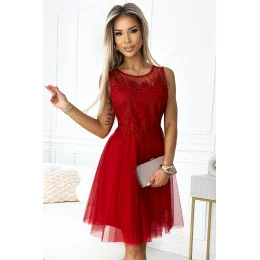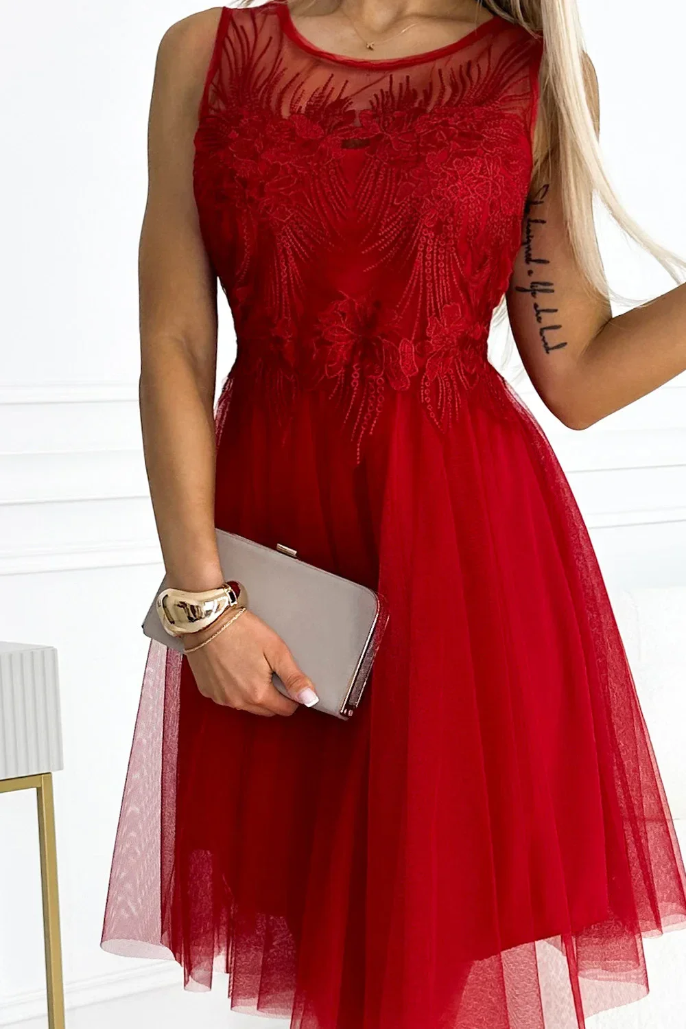 Přidání recenze k 522-3 CATERINA Dámské šaty s gipure a jemným tylem - ČERVENÉ