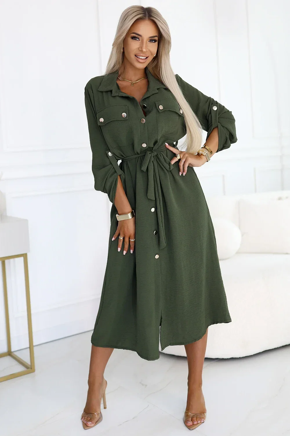 Stylové košilové šaty v khaki barvě od značky Numoco Basic jsou dokonalým spojením elegance a pohodlí. Jsou vyrobeny z vysoce kvalitní látky evropské výroby a zaručují pohodlné celodenní nošení. Šaty mají zapínání na knoflíky, dlouhé rukávy s možností rozepnutí a praktický pásek, který krásně zvýrazní pas. Skvěle se hodí na každodenní nošení, do práce, na obchodní schůzky i na večery. Objednávejte nyní a podtrhněte svůj styl! ❤️