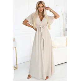 Elegantní béžové maxi šaty s obálkovým výstřihem, lehkými rukávy a zavazováním v pase. Vzdušné, ženské a ideální na svatbu, přijímání nebo večírek.