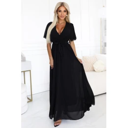 545-5 Dlouhé šaty se skládaným výstřihem a vázáním - ČERNÁ