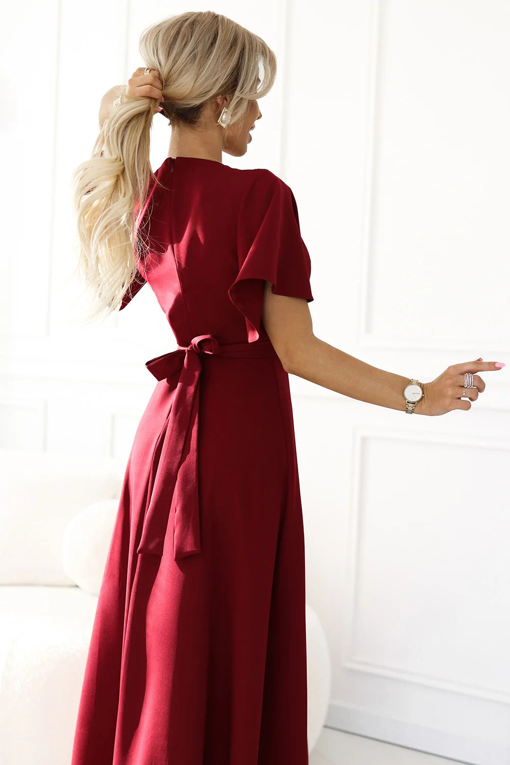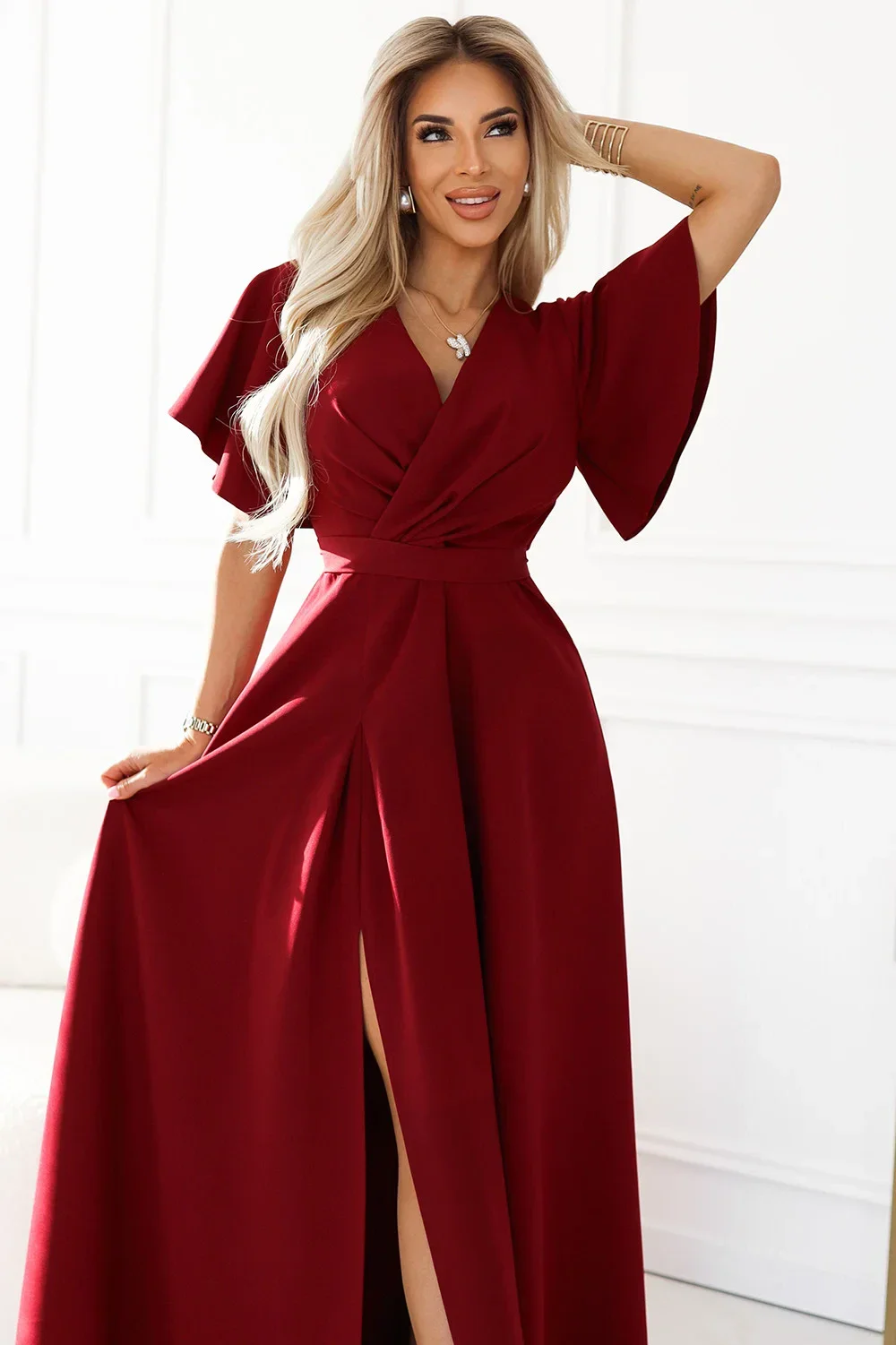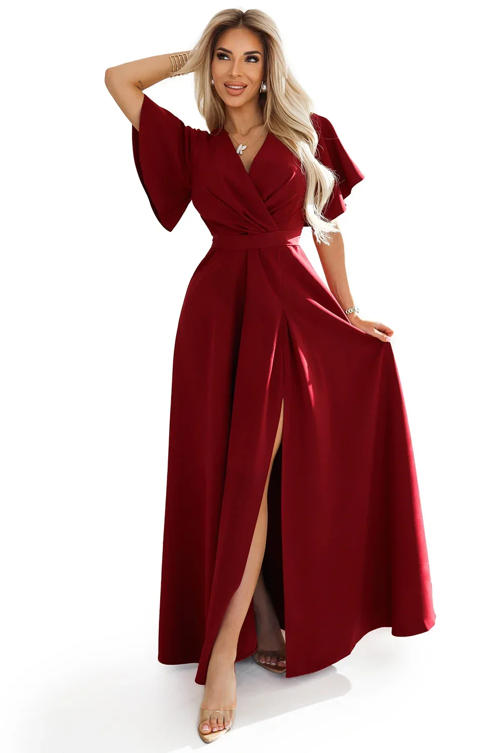 Šaty Jennifer - elegantní dlouhé šaty z bordó látky. Obálkový výstřih, krátké rukávy a nápadný rozparek na nohavici dodávají šatům noblesu a ženský půvab. Přiléhavý střih s páskem krásně zvýrazní pas. Ideální pro zvláštní příležitosti, elegantní večírky a večerní vycházky.