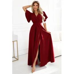 Dlouhé exkluzivní šaty s krátkými rukávy a výstřihem - vínové barvy