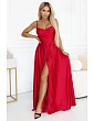 Horní díl s tenkými ramínky je zakončen obepínajícím řasením - krásně sedí na poprsí a vytváří elegantní, ženský dekolt. Šaty jsou v pase vypasované a níže přecházejí do dlouhé, splývavé sukně, která jemně pracuje s pohybem a opticky zeštíhluje siluetu, zejména v kombinaci s jehlovými podpatky.