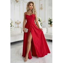 Červené maxi šaty Numoco Basic se srdíčkovým výstřihem, nastavitelnými ramínky a vysokým rozparkem. evropská výroba, ideální na svatbu.