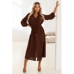 651-1 Šaty midi s knoflíky a páskem - čokoládové