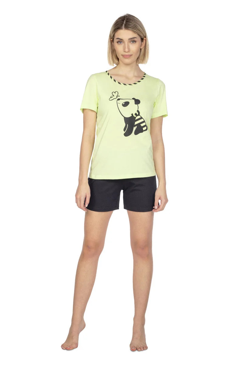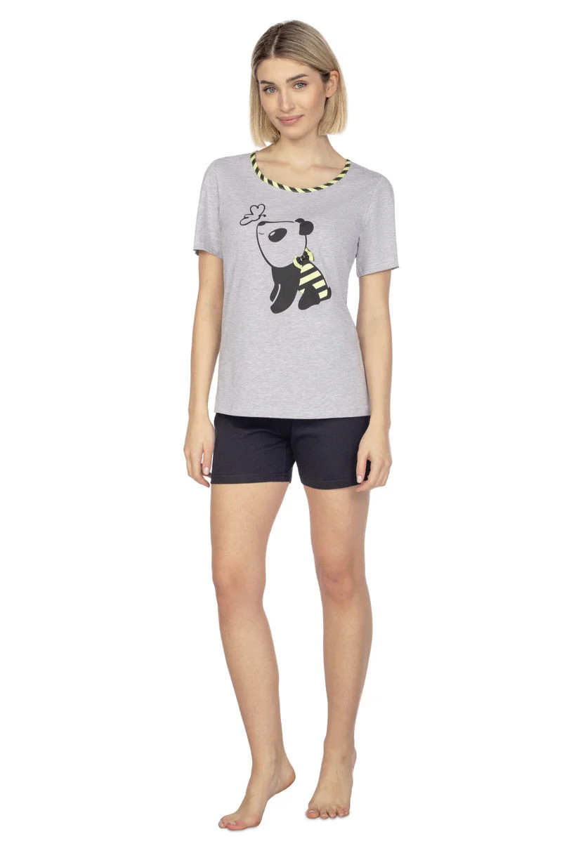 Dámské pyžamo s krátkými rukávy ušité z jemné bavlny. Ozdobný potisk na úrovni hrudníku. Kulatý výstřih lemovaný kontrastní lamówkou. Krátké jednotné šortky.