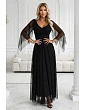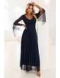 Horní díl s elegantním výstřihem do V krásně odhaluje dekolt a klíční kosti, zatímco jemné řasení dodává lehkost a noblesu. Pas je výrazně zvýrazněn, což dodává siluetě harmonické proporce. Dlouhý splývavý lem je volně splývavý, opticky zeštíhluje a je pohodlný i ve větších velikostech, proto tento model dobře funguje i jako plus size šaty. Splývavé poloprůhledné rukávy dodávají celkovému vzhledu éterický vzhled a v pohybu působí nádherně.