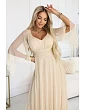 655-4 Dlouhé lehké třpytivé šaty s výstřihem a průhlednými rukávy - šampaňsko-béžová barva