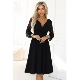 657-1 Elegantní midi šaty s obálkovým výstřihem a tylovými rukávy - černé