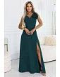 Model má výstřih do V a široká ramínka, která pevně sedí na ramenou, s poutavou 3D látkovou růží na jednom rameni. V pase je pásek a vzadu motýlek, díky němuž lze snadno upravit lem. Dlouhá rozšířená sukně má na nohavicích vysoký rozparek, který dodává lehkost při chůzi.