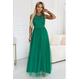 Zelené tylové maxi šaty s vyšívanou krajkou - Numoco Basic