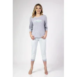 Dámské pyžamo s 3/4 dlouhými rukávy, vpředu zdobené potiskem, doplněné rybářskými kalhotami s pohodlnou šňůrkou v pase.