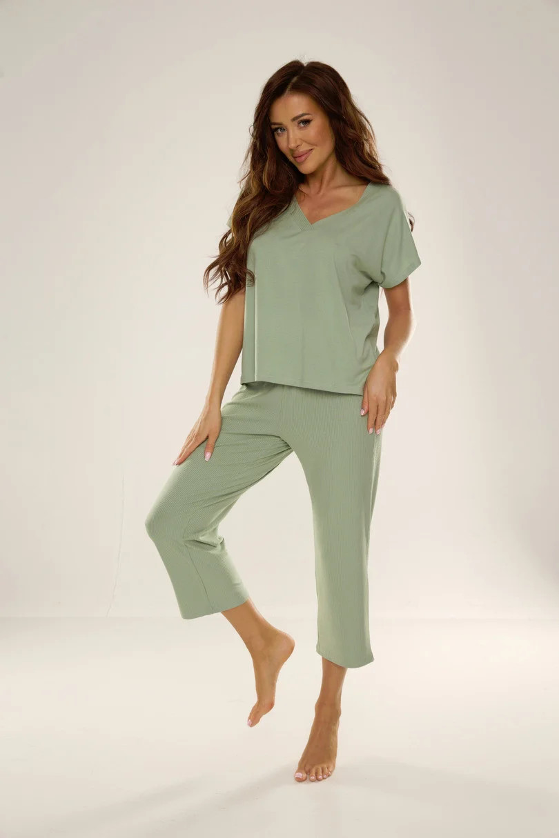 Dámské pyžamo s krátkými rukávy, volného a pohodlného střihu, ušité z měkké viskózy s elastanem. Doplňují je 3/4 kalhoty z žebrované viskózy.
