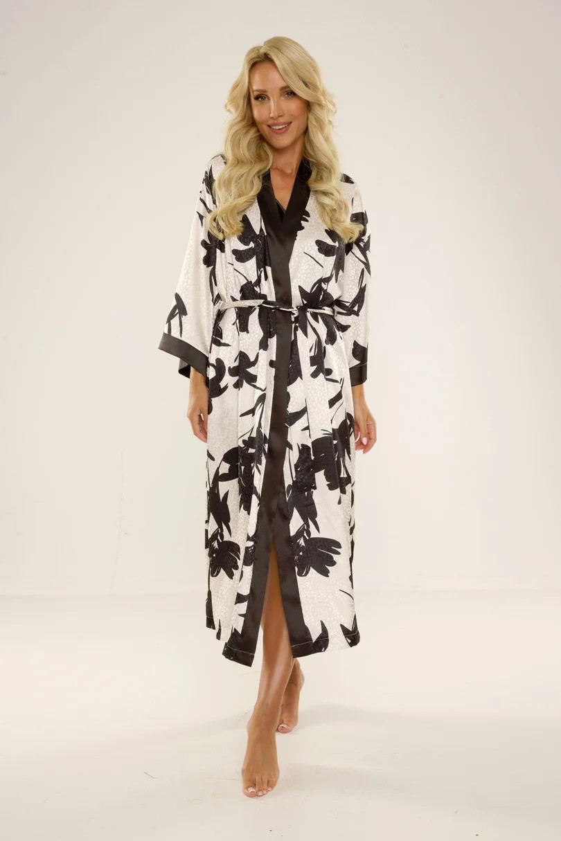 Elegantní vzdušný dámský župan vázaný v pase ušitý z jemného saténu. Délka rukávu 7/8.
