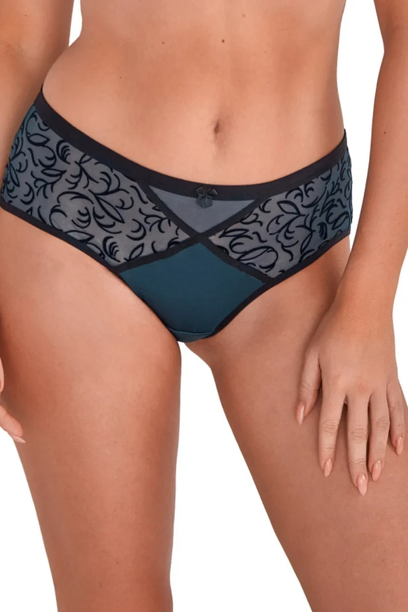 Pevné kalhotky z měkké síťoviny pokryté černým flokem. Zadní část z hladkého mikrovlákna, zakončená dvojitě skládaným tylem.