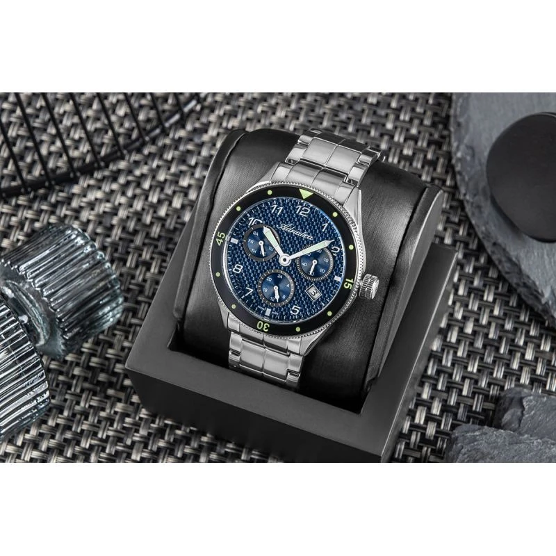 Męskui zegarek Adriatica A8322.5155QF został stworzony z myślą o mężczyznach, którzy cenią siłę detalu i techniczną precyzję. Niebieska tarcza o strukturze włókna węglowego nadaje mu sportowy, nowoczesny charakter, a masywna stalowa koperta i bransoleta gwarantują trwałość na lata. Trzy funkcjonalne chronografy wskazują dzień tygodnia, czas 24-godzinny oraz licznik sekund – wszystko czytelnie, konkretnie i na miejscu. Obracany bezel z naniesioną skalą minutową to nie tylko detal wizualny, ale i praktyczne narzędzie do odmierzania czasu. Zegarek napędzany jest szwajcarskim mechanizmem kwarcowym Ronda X30 Swiss Made, który nie zawodzi. Całość chroniona jest przez wysokiej klasy szkło mineralne z antyreflexem,odporne na zarysowania – rozwiązanie, które doceni każdy, kto ceni trwałość i estetykę.