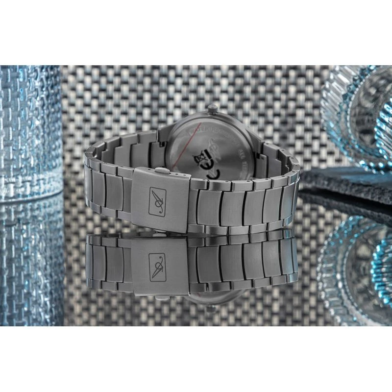 Náramek vyrobený z titanu nejvyšší kvality v sobě spojuje výjimečnou lehkost, odolnost proti korozi a moderní trvanlivost. Jeho matná povrchová úprava dodává hodinkám jemně technický a zároveň elegantní vzhled. Robustní, ale přitom mimořádně pohodlný při nošení - ideální pro každodenní nošení i pro náročnější podmínky. Přesná spona s vyrytým logem podtrhuje pozornost věnovanou detailům a švýcarský rodokmen modelu.