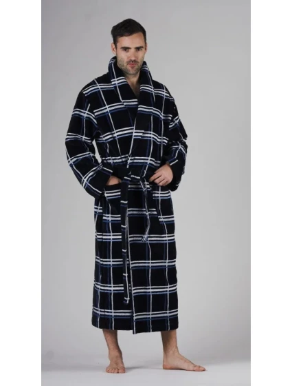 Dlouhý pánský bavlněný župan, tmavě modré kostky s bílými a světle modrými pruhy, 510g/m2.