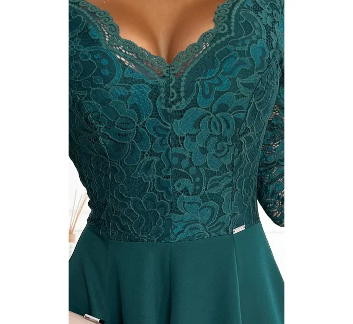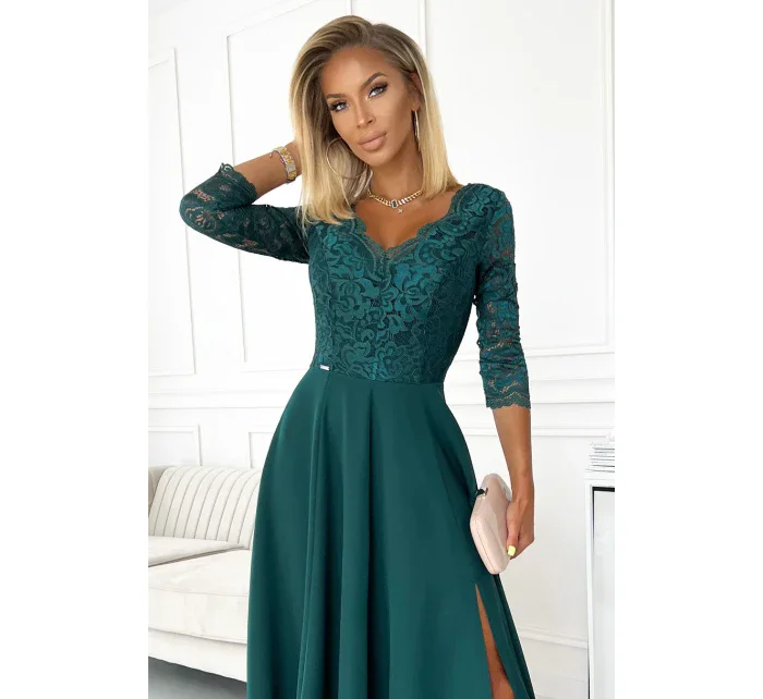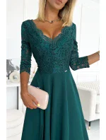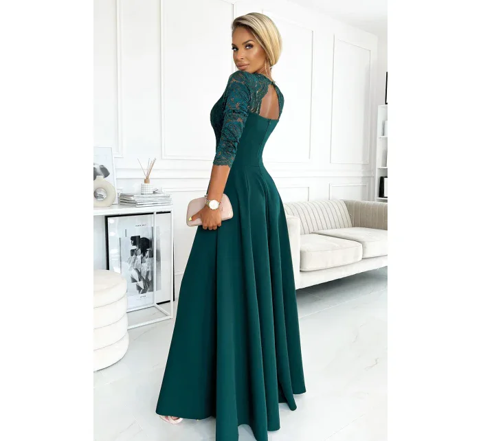 AMBER - Elegantní dlouhé dámské krajkové šaty v lahvově zelené barvě s výstřihem 309-5